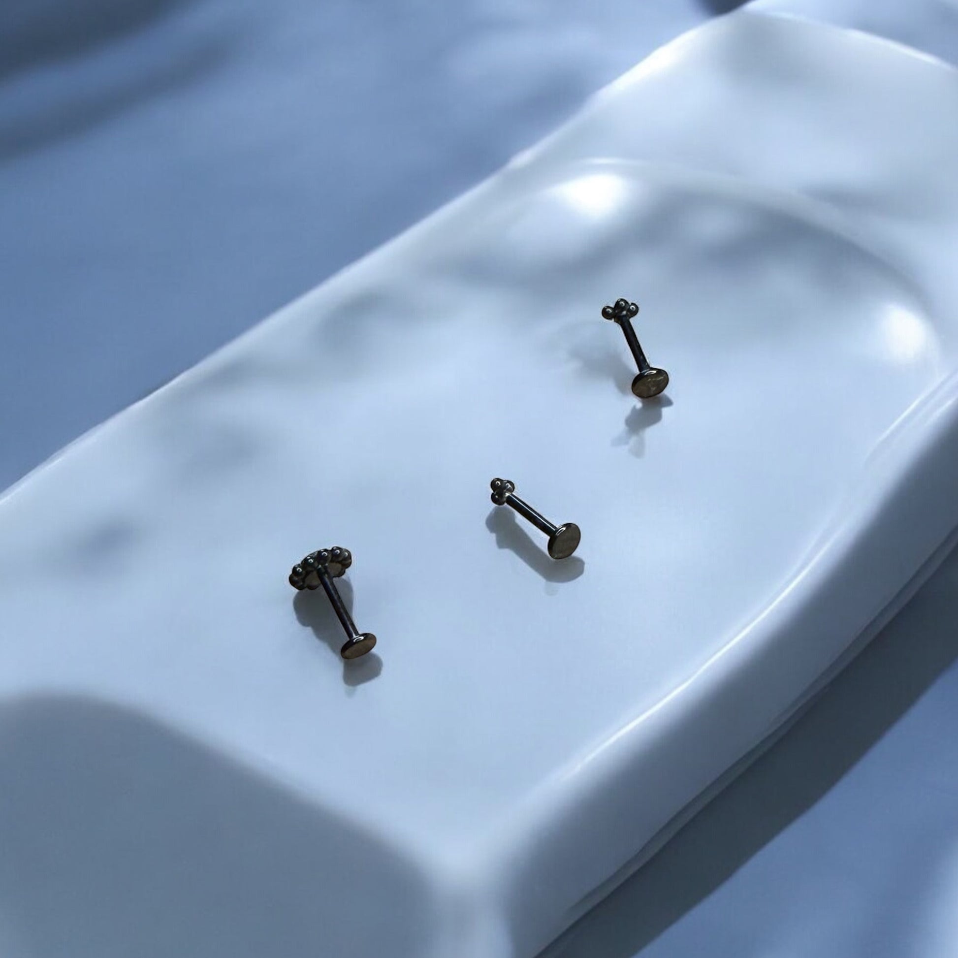 This black beaded labret piercing combines minimalistic design with durable surgical steel construction. Featuring an 8mm post with a flat back and internally threaded closure, it ensures secure, comfortable wear while minimizing irritation. Ideal for those seeking a sleek, professional look with reliable quality.