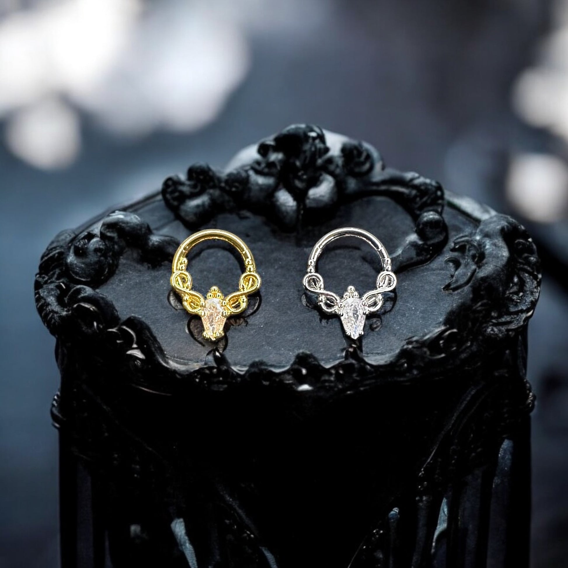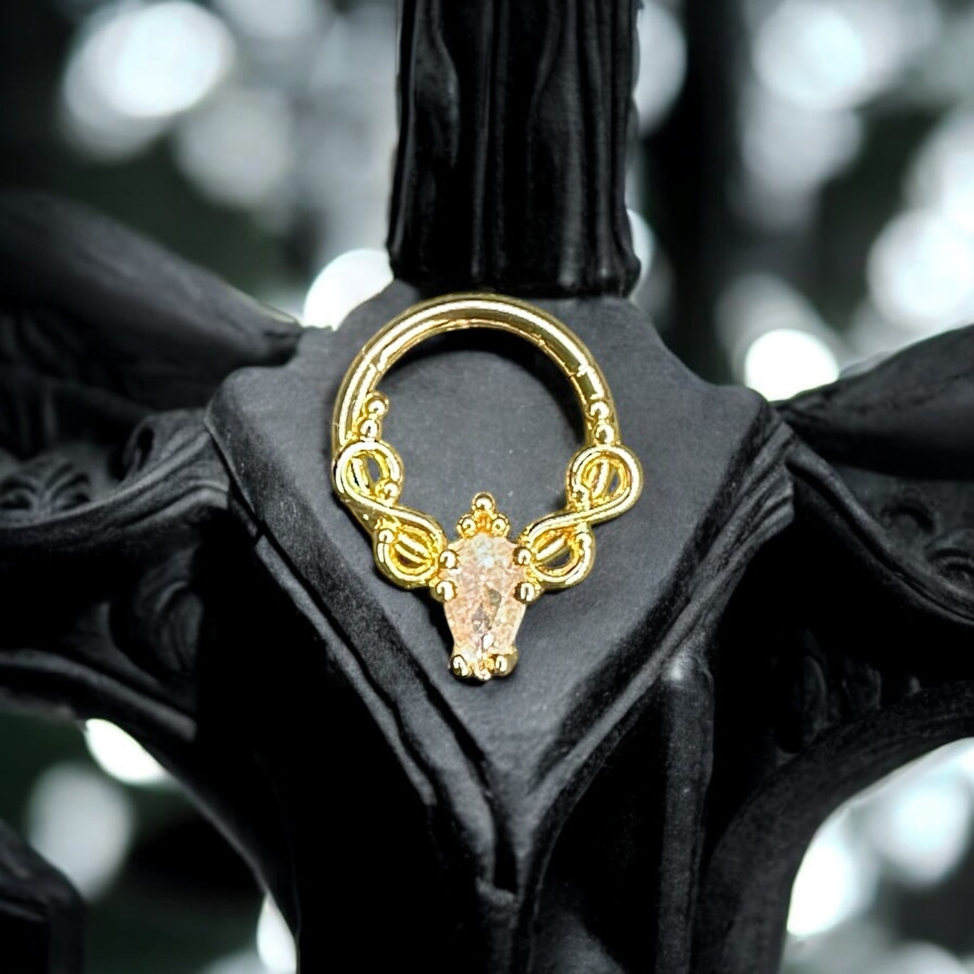 Designed for the piercing enthusiast, our dagger style body piercing ring offers a sleek and edgy look. Made with surgical steel, it ensures durability and hypoallergenic wear. The hinged clicker allows for easy insertion and removal, while the 8mm size offers versatility. Available in both gold and silver options.