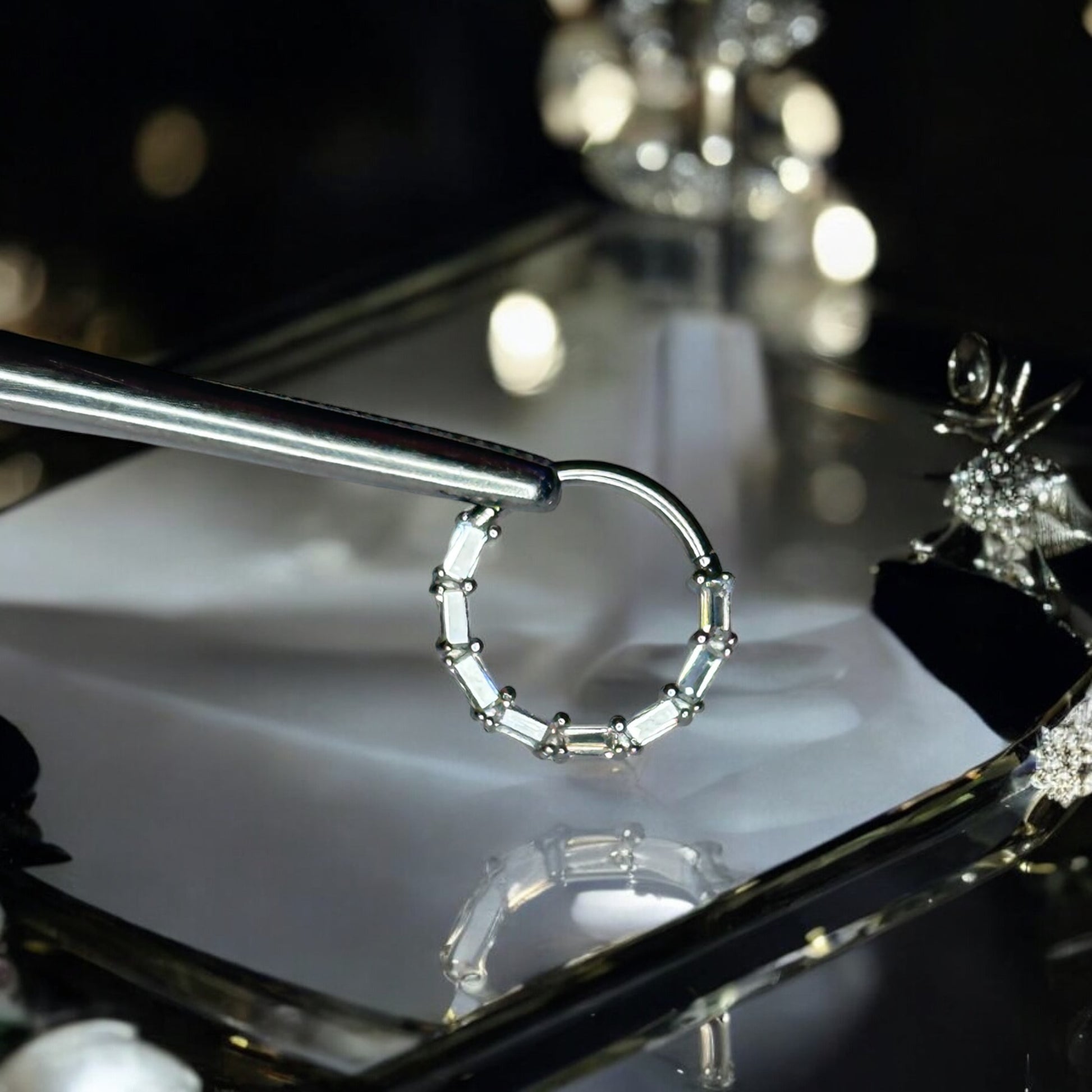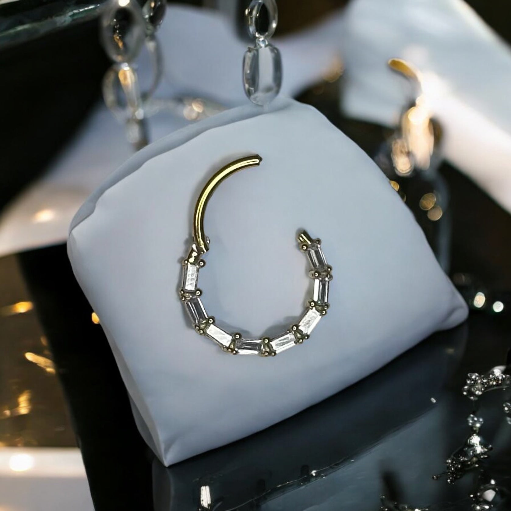 Expertly crafted with a sleek glass bamboo design, this 16G piercing ring features a convenient clicker hinge and is made with surgical steel for a comfortable and durable fit. Available in both silver and gold options, it's the perfect statement piece for any piercing collection.