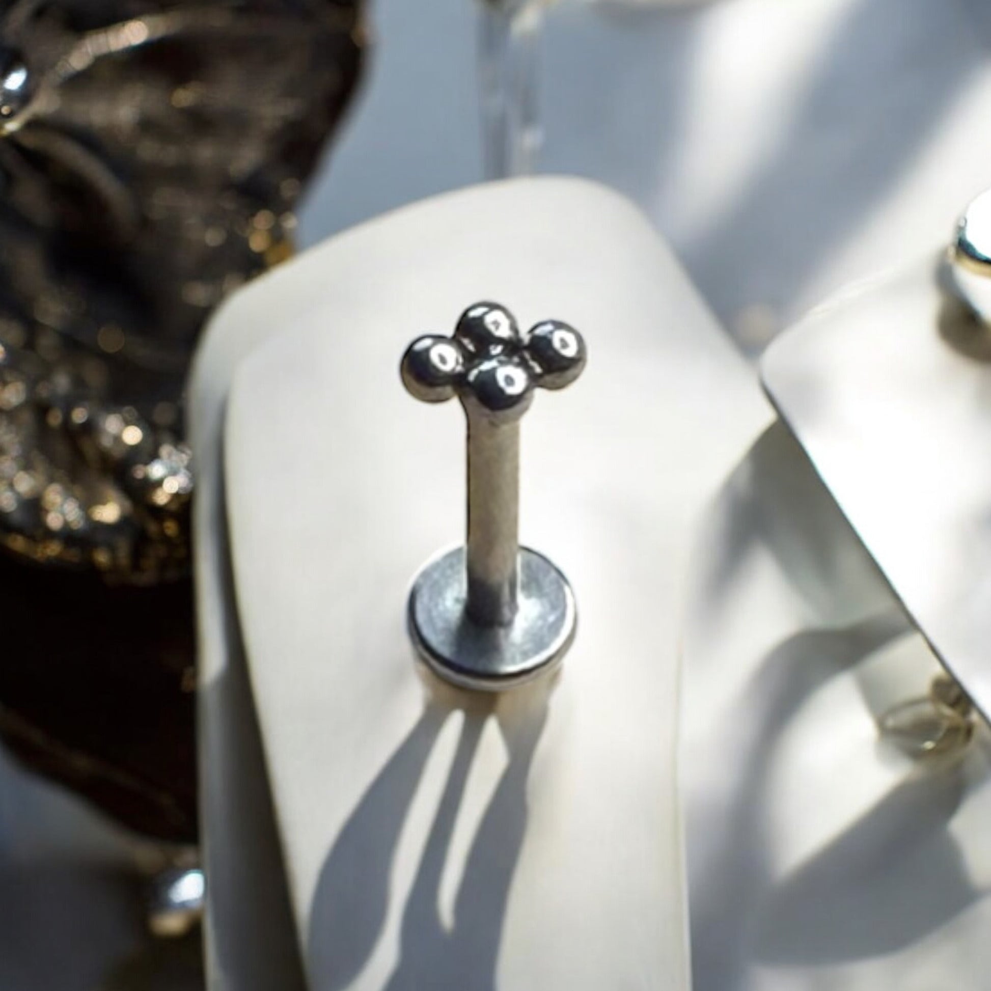 This silver ornate beaded labret piercing features a beautifully detailed design crafted from high-quality surgical steel. With a 16G gauge and a flat back for enhanced comfort, it is designed for everyday wear. The internally threaded 8mm post ensures secure placement and easy handling, making it a reliable choice for those seeking both style and professional-grade body jewelry.