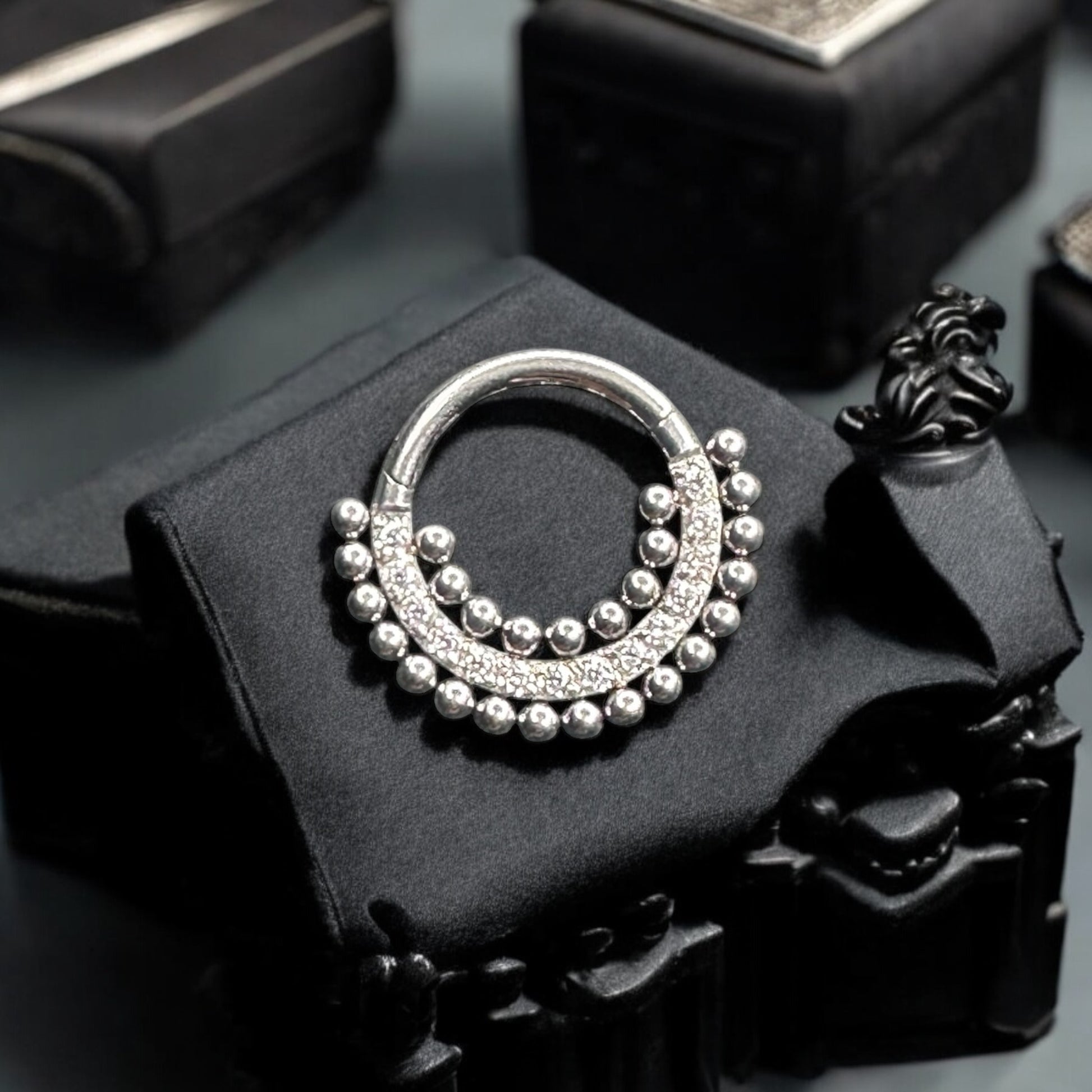This triple row, stoned tribal piercing ring is expertly crafted from titanium and features an 8mm size. The convenient clicker hinge allows for easy use, while the option of gold or silver adds a touch of versatility. Upgrade your piercing game with this stylish and functional piece.